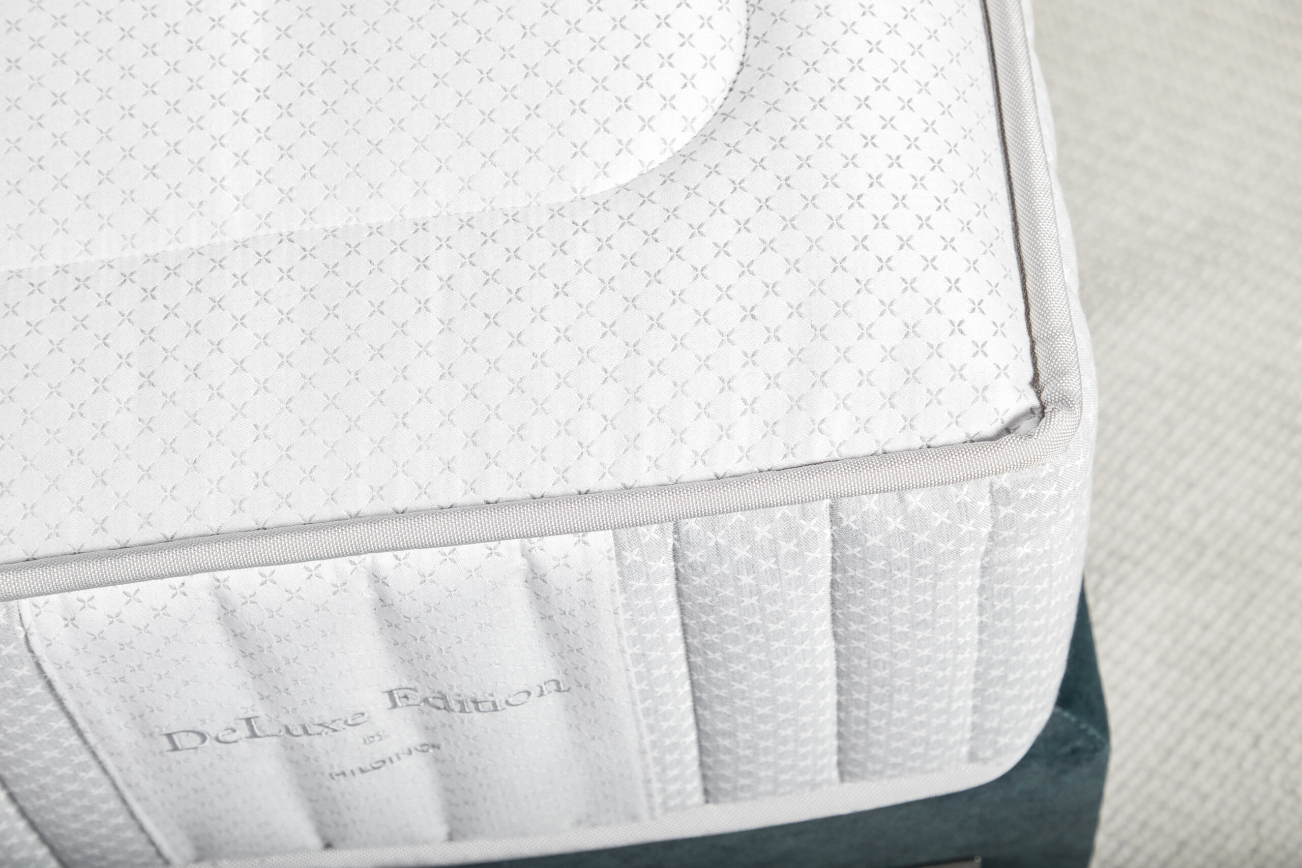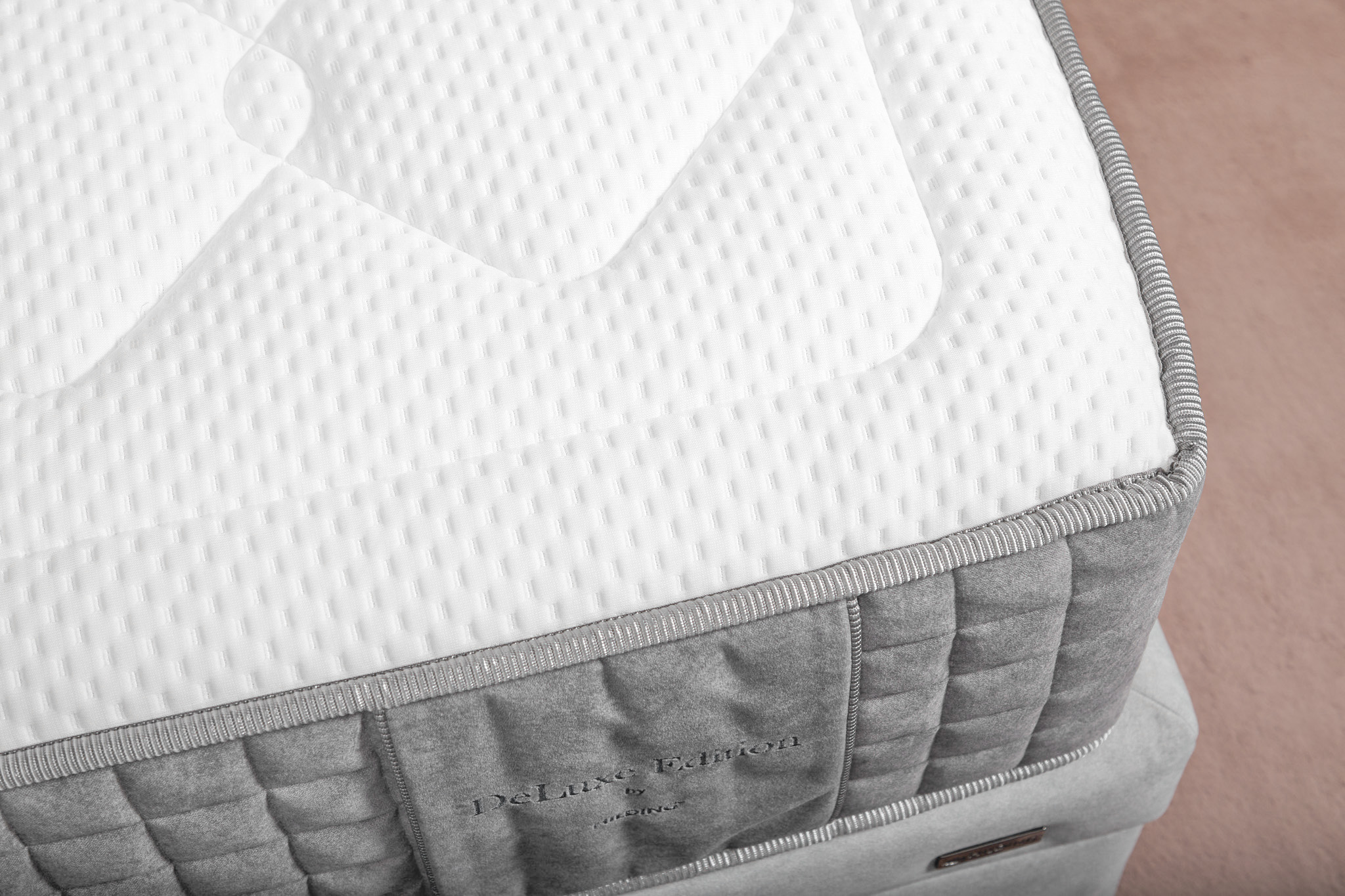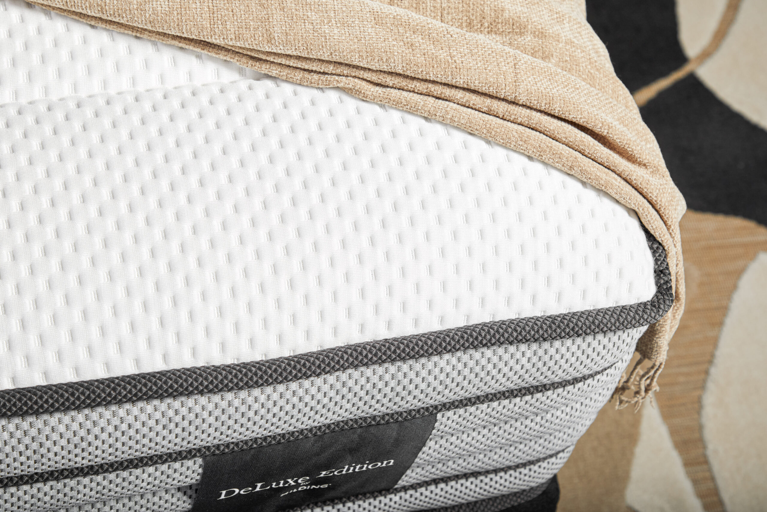 Pokrowiec Glamour to połączenie luksusu i funkcjonalności. Jego górna warstwa została wykonana z niezwykle miękkiej w dotyku, białej tkaniny, ozdobionej efektownym, geometrycznym wzorem. Zapewnia wyjątkową oddychalność, dzięki czemu tworzy idealne warunki do snu, regulując temperaturę i zapewniając doskonałą wentylację. Wysokie boki pokrowca zostały obszyte miękkim welurem o eleganckim odcieniu szarości, a ich krawędzie zdobi dekoracyjna, prążkowana lamówka. Spód materaca został wyłożony innowacyjnym materiałem 3D, który pozwala na swobodny przepływ powietrza wewnątrz materaca.